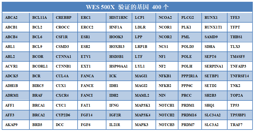 表4. 500X WES驗證的400個(gè)基因信息 9. 基因覆蓋科學(xué),超過(guò)400個(gè)基因,覆蓋國內外多個(gè)知名panel的設計;
