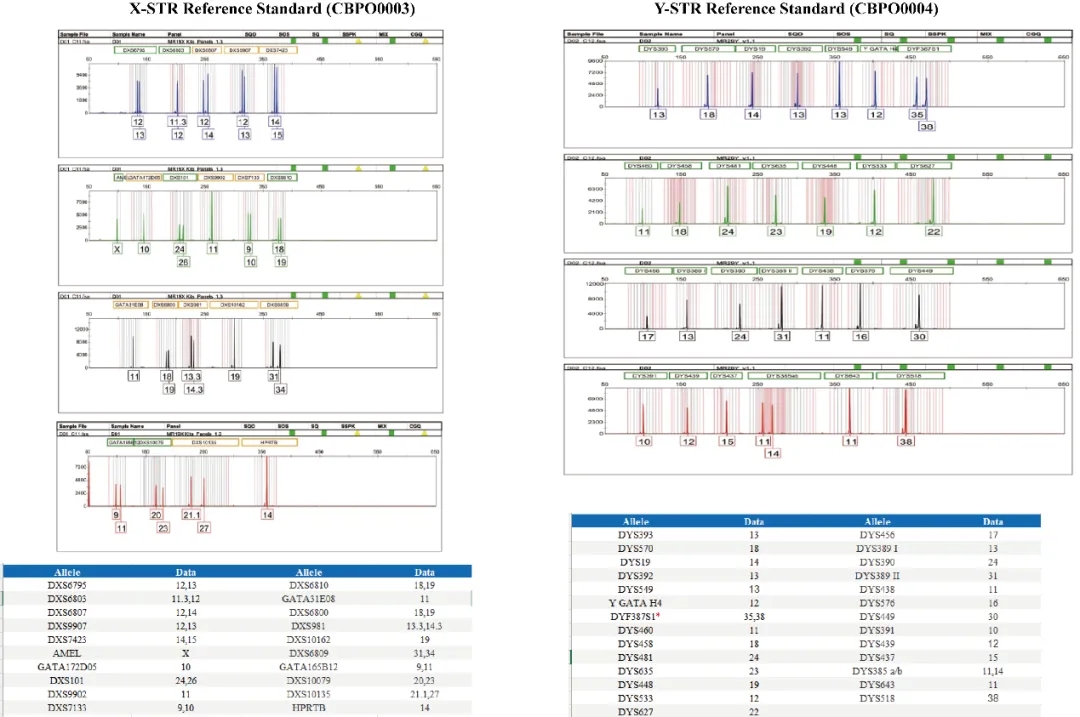 X染色體標準品包含19個(gè)X-STR基因座和一個(gè)性別位點(diǎn)Amelogenin。Y染色體標準品包含22個(gè)低頻突變Y-STR基因座和7個(gè)高頻突變Y-STR基因座。低頻突變和高頻突變基因座相結合具有更高的個(gè)體識別能力,提供了強大的兼容性和排查能力。