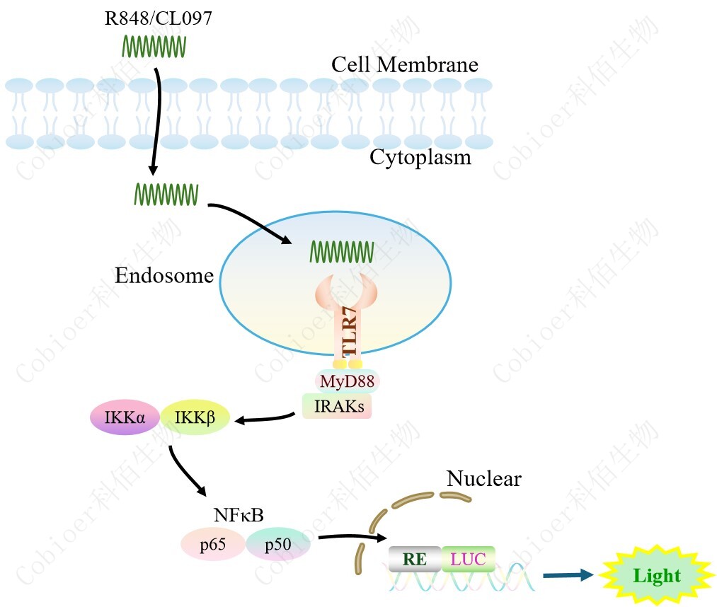 TLR7 NFκB-Luc HEK293 報告基因藥靶模型很好的模擬了體內 TLR7 的信號轉導過(guò)程, 原理見(jiàn)下圖所示。