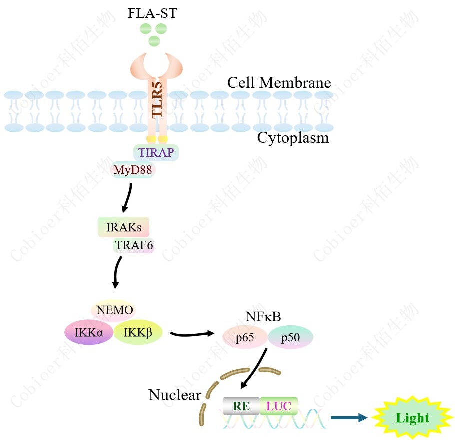 TLR5 NFκB-Luc HEK293 報告基因藥靶模型很好的模擬了體內 TLR5 的信號轉導過(guò)程, 原理見(jiàn)下圖所示。