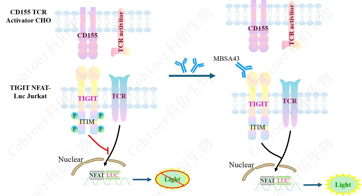 CD155 TCR Activator CHO 細胞作為 TIGIT NFAT-Luc Jurkat 細胞的靶細胞,很好的模 擬了體內 TIGIT 的信號轉導過(guò)程,原理見(jiàn)下圖所示。