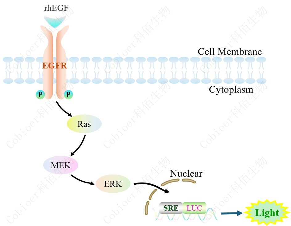 SRE-Luc HEK293 報告基因細胞是由 SRE 調控并表達 Luc 熒光素酶報 告基因的 HEK293 細胞。EGF 與受體結合,激活 SRE 的原理見(jiàn)下圖所示。![]() Figure 1. SRE-Luc HEK293 細胞模型原理圖