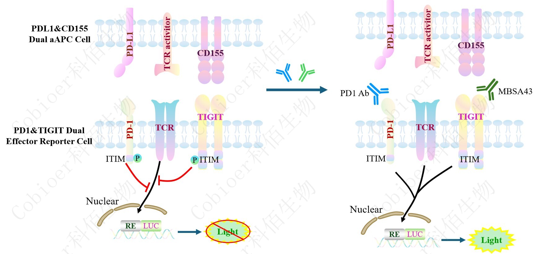 PDL1&CD155 TCR Activator CHO 作為 PD1&TIGIT Dual Effector Reporter Cell 的靶細 胞,很好的模擬了體內 PD1&TIGIT 的信號轉導過(guò)程,原理見(jiàn)下圖所示。
