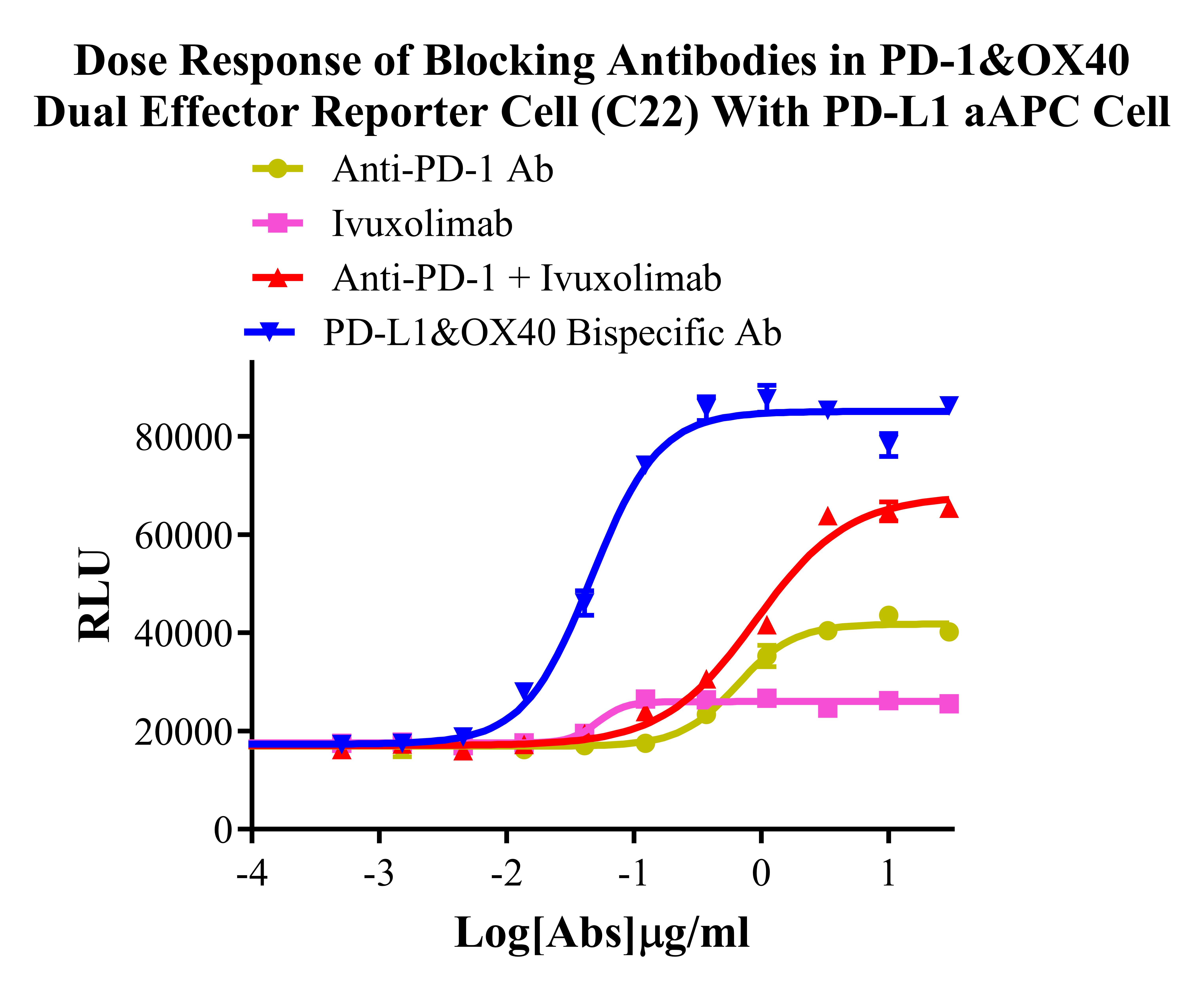 Figure 4. Dose Response of Blocking Antibodies in PD-1&OX40 Dual Effector Reporter Cells (C22) With PD-L1 aAPC Cells.