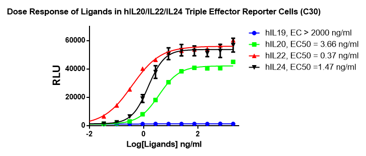 Figure 2. Dose Response of Ligands in hlL20/IL22/lL24 Triple Effector Reporter Cells (C30). |