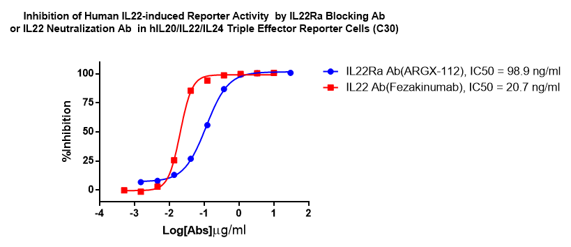 Figure 3. Inhibition of Human lL22-induced Reporter Activity by lL22Ra Blocking Ab or lL22 Neutralization Ab in hIL20/IL22/IL24 Triple Effector Reporter Cells (C30). |