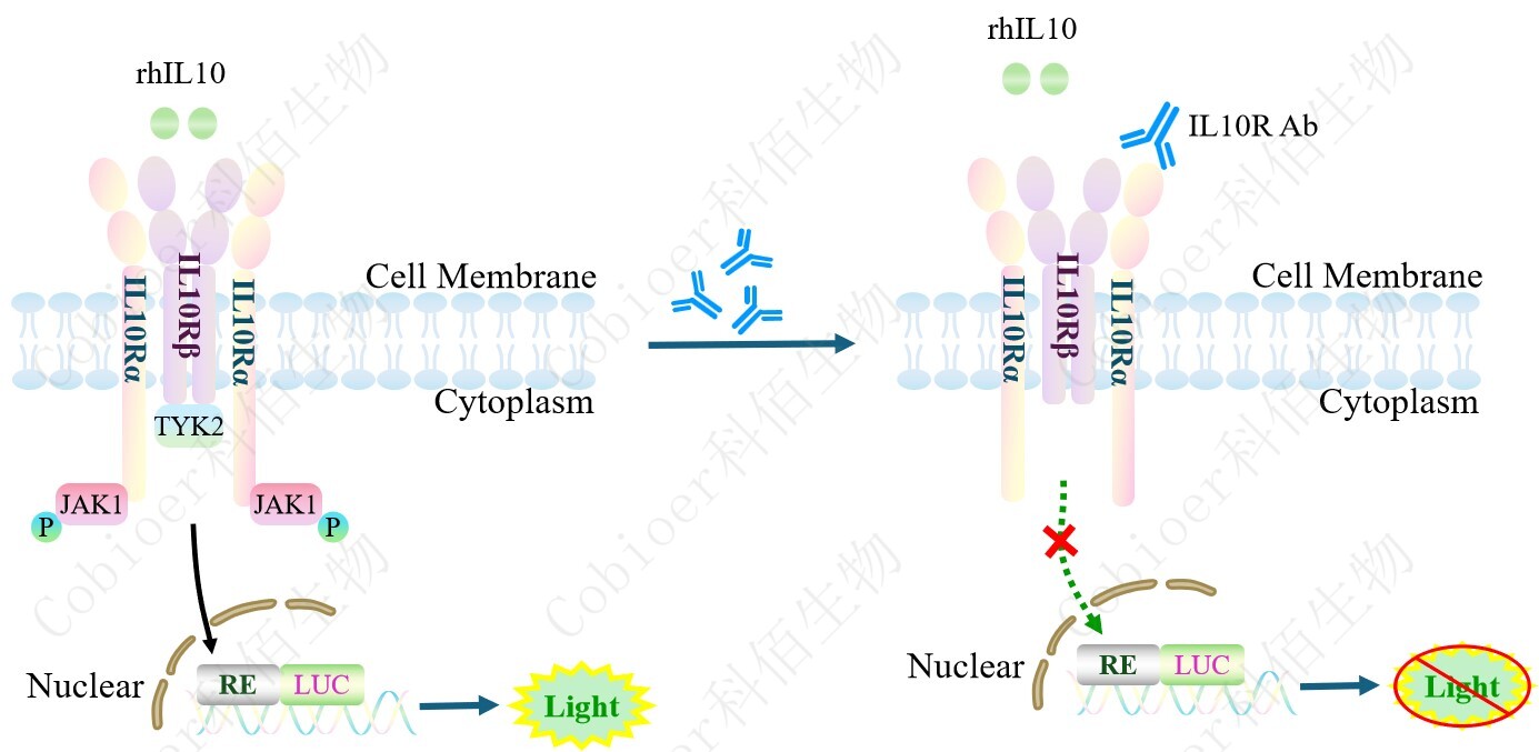 IL10 Effector Reporter Cell 報告基因藥靶模型很好的模擬了體內 IL10 的信號轉導過(guò)程, 原理見(jiàn)下圖所示。