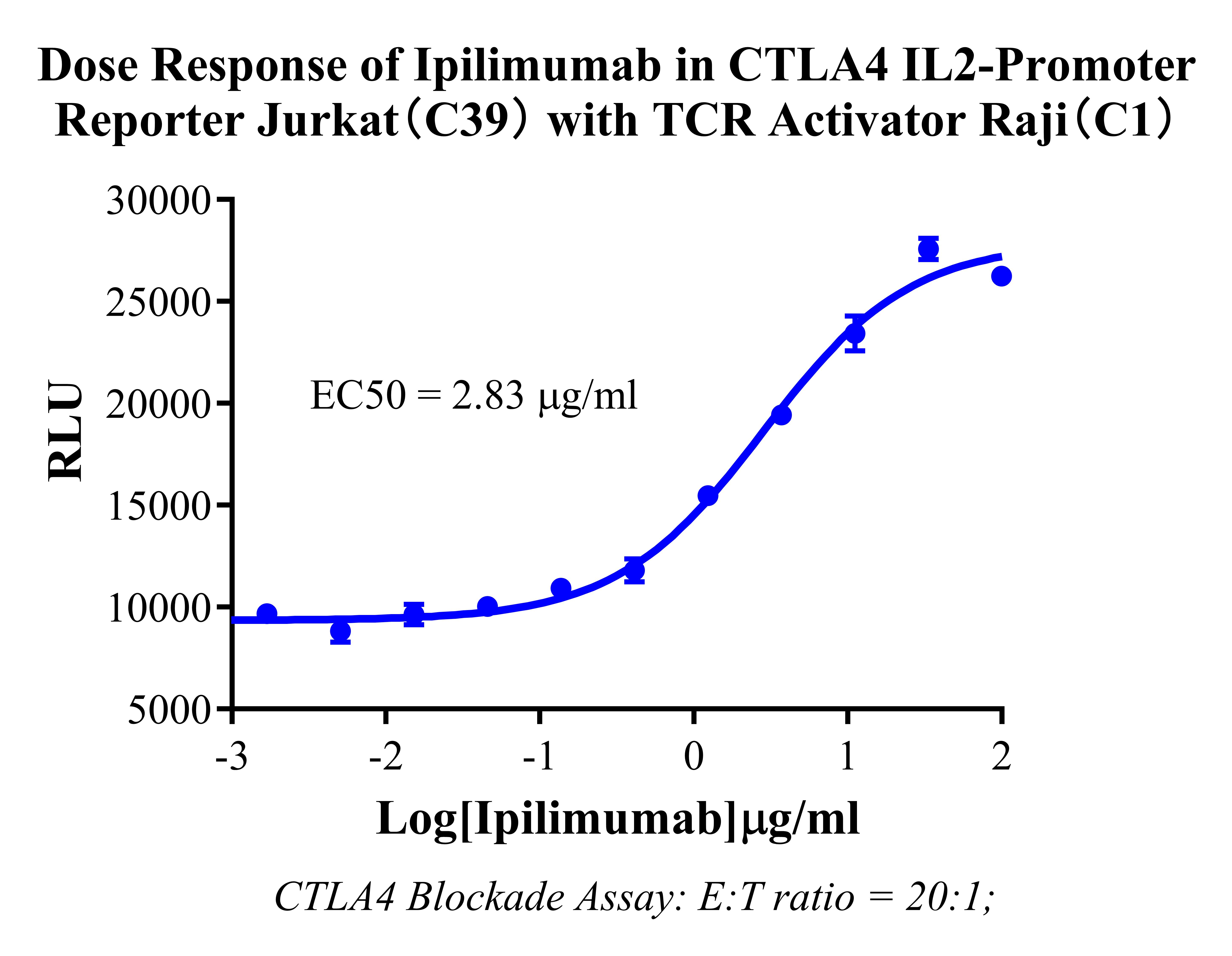 Figure 2. Dose Response of lpilimumab in CTLA4/IL2 Promoter Reporter-Jurkat Cells (C39) with TCR Activator Cell, the EC50=2.83μg/ml .