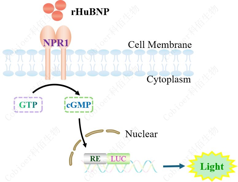 BNP/NPR1 Effector Reporter Cell 報告基因藥靶模型很好的模擬了體內 NPR1 的信號轉導過(guò)程,原理見(jiàn)下圖所示。![]() Figure 1. BNP/NPR1 Effector Reporter Cell 細胞模型原理圖 |