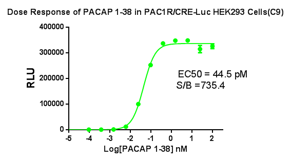 Figure 2.Detect Luciferase assay by Ultra Luciferase Detection Kit CBPH0001(we strongly suggest to purchase from Cobioer). Dose Response of PACAP 1-38 in PAC1R/CRE-Luc HEK293 Cells(C9). |