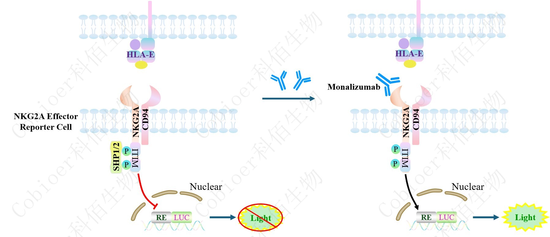 NKG2A Effector Reporter Cell 報告基因藥靶模型很好的模擬了體內 NKG2A 的信號轉導過(guò)程,原理見(jiàn)下圖所示。