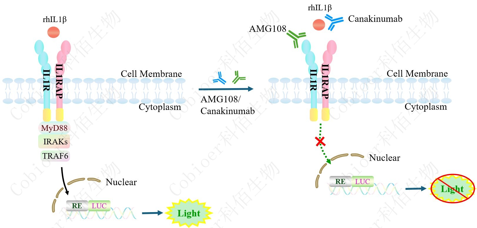 IL1 Effector Reporter Cell 報告基因藥靶模型很好的模擬了體內 IL1 的信號轉導過(guò)程, 原理見(jiàn)下圖所示。