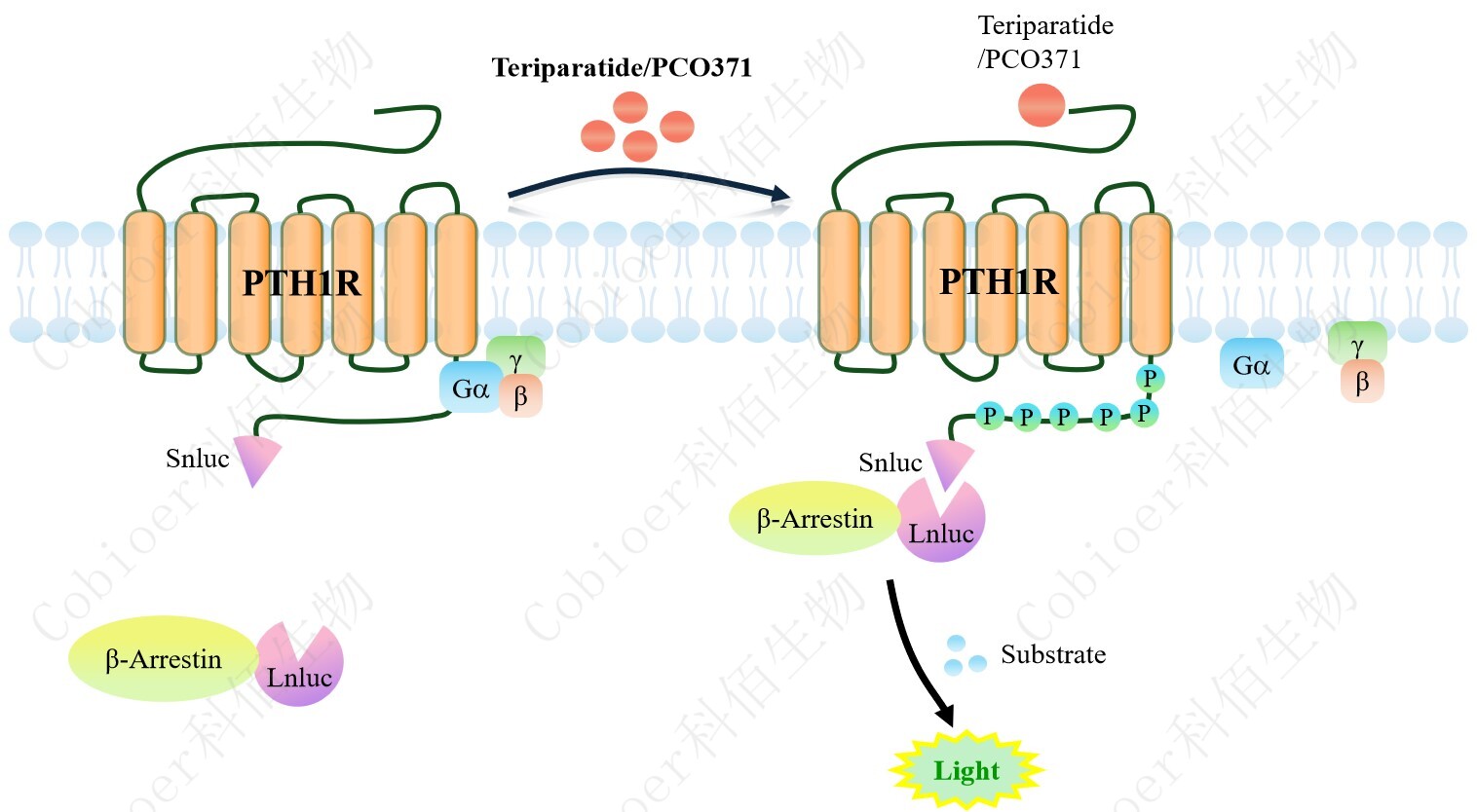 PTH1R β-Arrestin CHO PTH1R β-Arrestin CHO 報告基因藥靶模型很好的模擬了體內 PTH1R/β-Arrestin 的信號 轉導過(guò)程,原理見(jiàn)下圖所示。當缺乏配體刺激時(shí),β-Arrestin 不與 PTH1R 結合,融合β- Arrestin 的熒光素酶處于失活構象,當 PTH1R 遭遇配體刺激時(shí),融合熒光素酶報告基因的 β-Arrestin 被招募,使熒光素酶報告基因處于激活狀態(tài),加入其底物后發(fā)光信號增強。 ![]() Figure 1. PTH1R β-Arrestin CHO 細胞模型原理圖 |