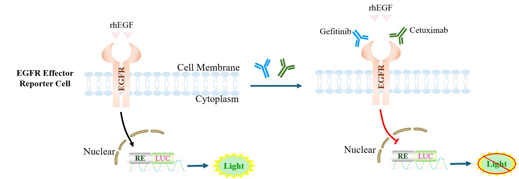 EGFR Effector Reporter Cell 報告基因藥靶模型很好的模擬了體內 EGFR 的信號轉導過(guò)程, 原理見(jiàn)下圖所示。