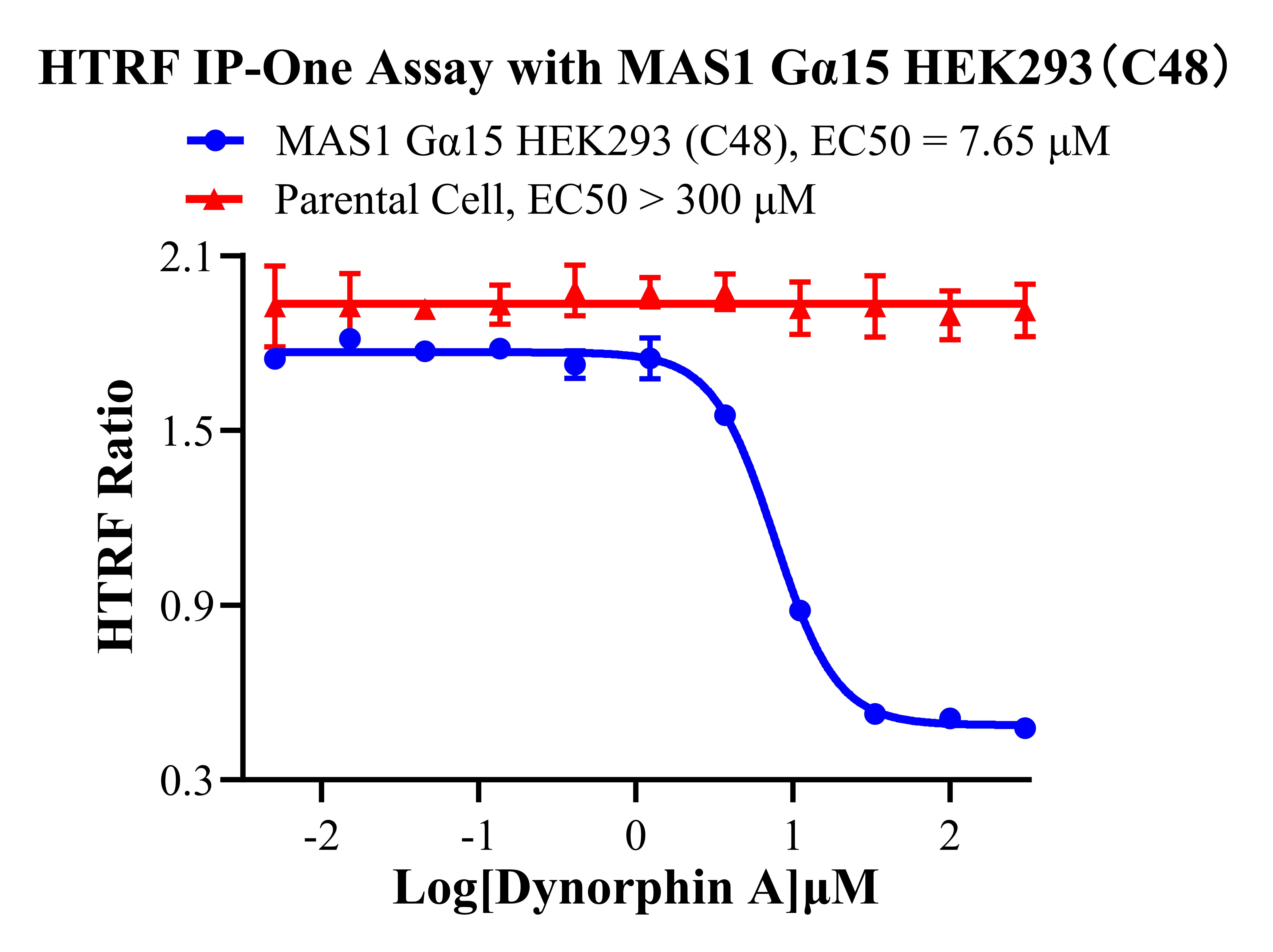 MAS1 可以通過(guò) Gq 蛋白的信號通路,調控 IP1 的升高。MAS1 與配體結合,導致 Gαq 亞基的激活,觸發(fā) PLC-γ,從而產(chǎn)生兩個(gè)第二信使:IP3 和 DAG,它們參與細胞內鈣動(dòng)員。 由于 IP3 在代謝上不穩定,因此測量通路激活的替代標志物 IP1 作為檢測標準。