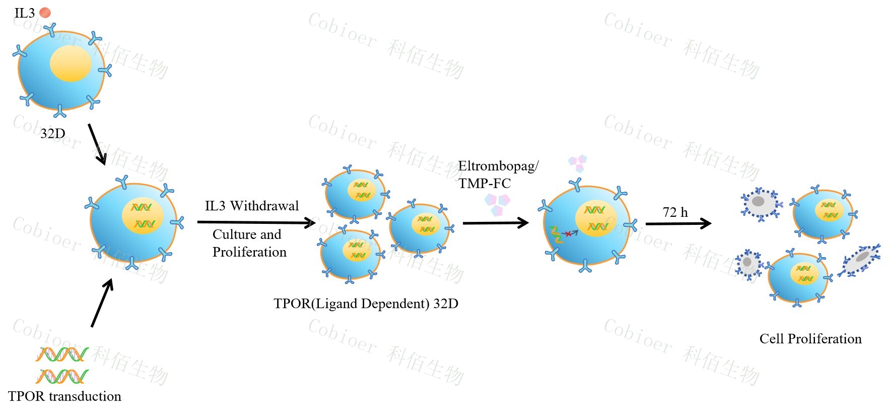 32D(小鼠原 B 細胞)的生長(cháng)和增殖需要 IL-3 的維持。通過(guò)引入各種表達激酶的基因, 能作為 32D 的驅動(dòng)基因,讓 32D 不再依賴(lài) IL-3 而增殖,進(jìn)而激酶基因成為 32D 增殖依賴(lài) 的驅動(dòng)基因,用于評估小分子藥物對激酶的靶向抑制作用,原理及流程見(jiàn)下圖所示。 Figure 1. TPOR(Ligand Dependent) 32D 細胞模型原理圖 |