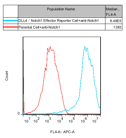 IV. Representative Data![]() Figure 2. Recombinant DLL4/Notch1 Effector Reporter Cell stably expressing Notch1. ![]() Figure 3. Blocking of DLL4 induced DLL4/Notch1 Effector Reporter Cell Activity by DLL4 Neutralizing Antibody with DLL4 Target Cell(C7). |