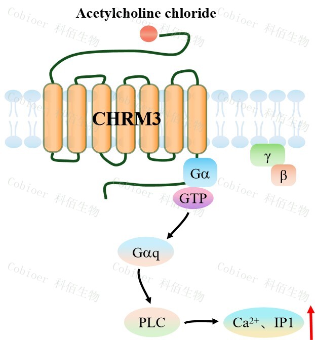 | CHRM3(Cholinergic Receptor Muscarinic 3)是毒蕈堿型乙酰膽堿受體(mAChRs)家 族的重要成員,屬于 GPCR,主要分布于外周組織(如 平滑肌、外分泌腺)及部分中樞區 域(如下丘腦),通過(guò)介導乙酰膽堿(ACh)信號調控平滑肌收縮、腺體分泌及能量代謝。 ACh 結合 CHRM3 后,激活 Gq/11 蛋白,啟動(dòng) PLCβ信號通路,水解 PIP2 生成 IP3 和 DAG, 觸發(fā)細胞內鈣離子釋放,激活蛋白激酶 C(PKC);通過(guò)β-arrestin 通路調控 ERK 磷酸化, 影響細胞增殖與炎癥反應。 | |
