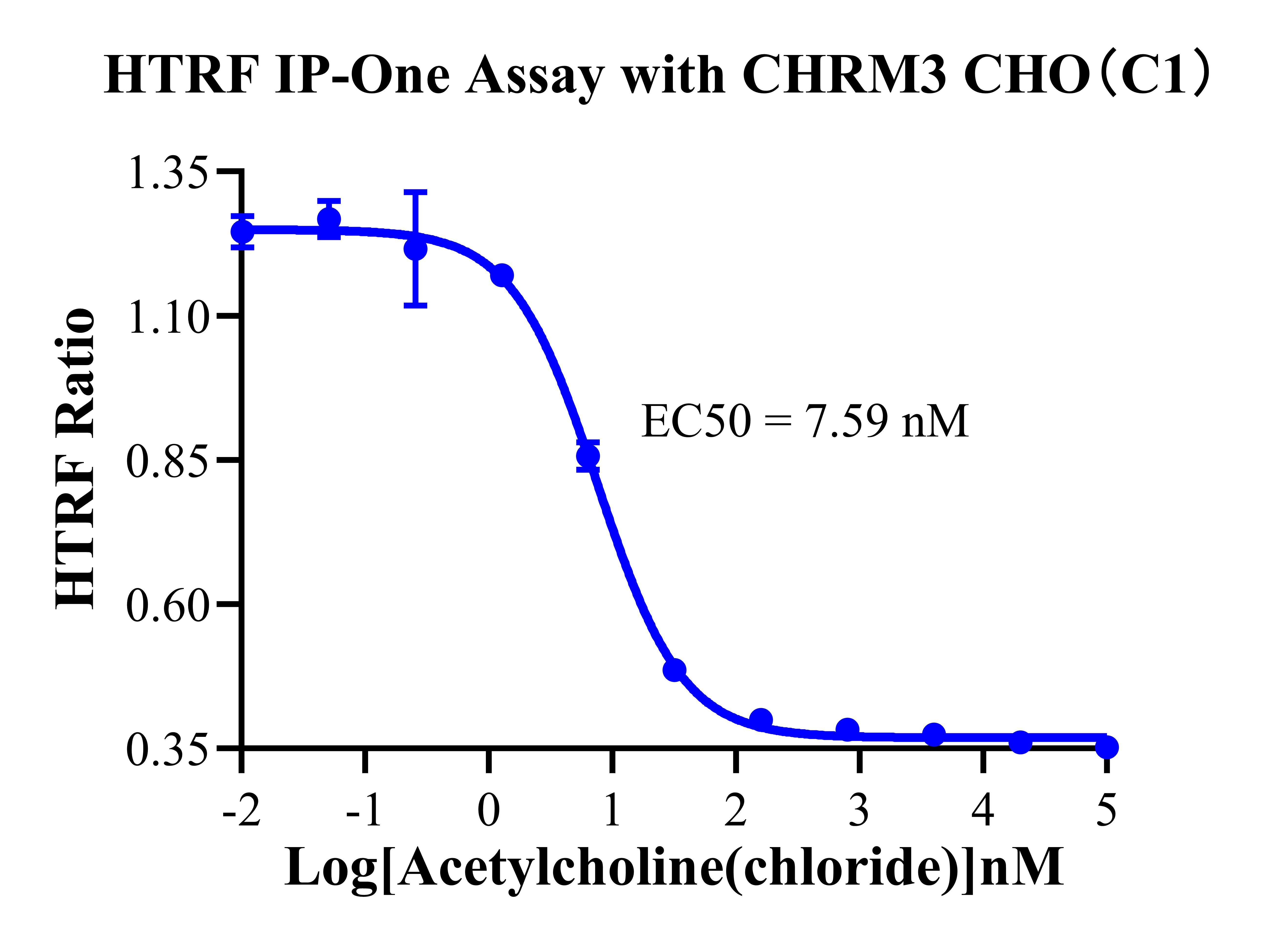 CHRM3 通過(guò) Gq 蛋白的信號通路,調控 IP1 的升高。CHRM3 與配體結合,導致 Gαq 亞基的激活,觸發(fā) PLC-γ,從而產(chǎn)生兩個(gè)第二信使:IP3 和 DAG,它們參與細胞內鈣動(dòng)員。 由于 IP3 在代謝上不穩定,因此測量通路激活的替代標志物 IP1 作為檢測標準。 CHRM3 CHO 細胞藥靶模型很好的模擬了體內 CHRM3 的信號轉導過(guò)程,原理見(jiàn)下圖所示。![]() Figure 1. CHRM3 CHO 細胞模型原理圖