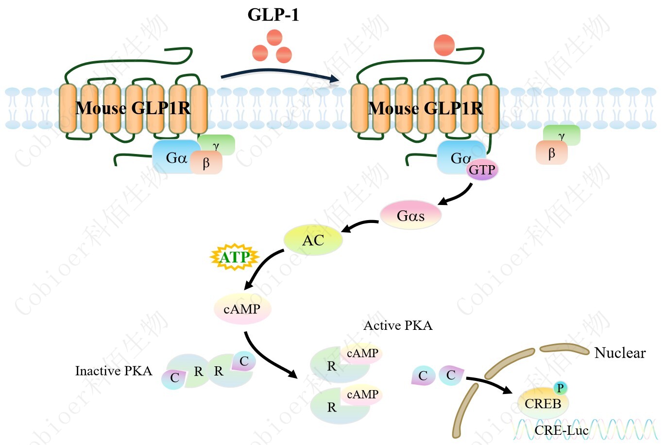 Mouse GLP1R CRE-Luc HEK293 報告基因藥靶模型很好的模擬了體內 GLP1R 的信號轉導過(guò)程,原理見(jiàn)下圖所示。![]() Figure 1. Mouse GLP1R CRE-Luc HEK293 細胞模型原理圖 |