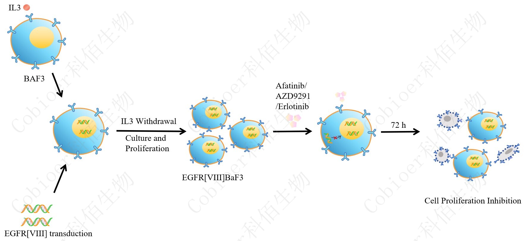 BaF3(小鼠原 B 細胞)的生長(cháng)和增殖需要 IL-3 的維持。通過(guò)引入各種表達激酶的基因, 能作為 BaF3 的驅動(dòng)基因,讓 BaF3 不再依賴(lài) IL-3 而增殖,進(jìn)而激酶基因成為 BaF3 增殖依 賴(lài)的驅動(dòng)基因,用于評估小分子藥物對激酶的靶向抑制作用,原理及流程見(jiàn)下圖所示。