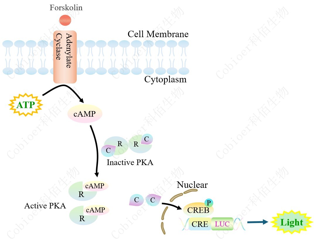 CRE-Luc HEK293 報告基因細胞是由 CRE 調控并表達 Luc 熒光素酶報告基因的 HEK293 細胞。Forskolin 是天然存在的直接腺苷酸環(huán)化酶(AC)/cAMP/CREB 的 激活劑,原理見(jiàn)下圖所示。![]() Figure 1:CRE-Luc HEK293 原理示意圖 |