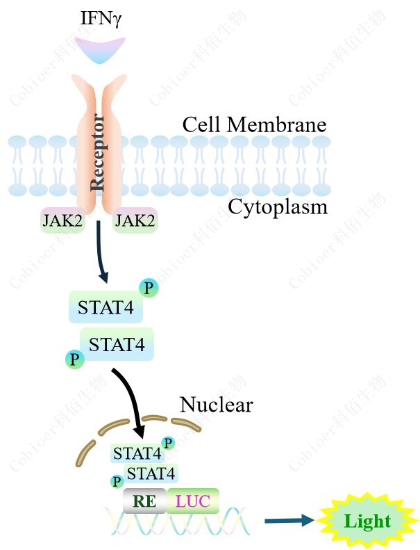 STAT4-Luc HEK293 報告基因細胞,是由 STAT4 調控并表達 Luc 熒光素 酶報告基因的 HEK293 細胞。IFNγ與受體結合,激活 STAT4 的原理見(jiàn)下圖所示。