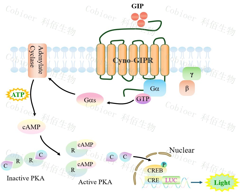![]() Figure 1. Cyno GIPR CRE-Luc HEK293 細胞模型原理圖