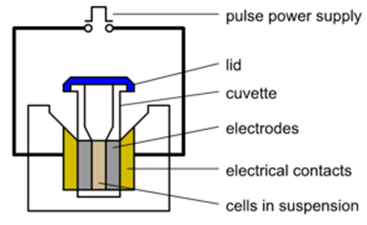 體外電穿孔時(shí),將靶細胞懸浮液與待導入細胞的質(zhì)粒DNA在導電溶液中混合,然后放入比色皿中(圖1)。電穿孔比色皿的樣品室兩側各有一塊金屬板,電流可以通過(guò)混合物。將比色皿放入電穿孔儀的腔室中,該腔室配有相應的電觸點(diǎn),使比色皿形成電路。電穿孔儀上的控制器允許用戶(hù)設置待輸送電脈沖的電壓、波形和持續時(shí)間,這些參數應根據靶細胞類(lèi)型進(jìn)行優(yōu)化。然后,電脈沖通過(guò)樣品室。