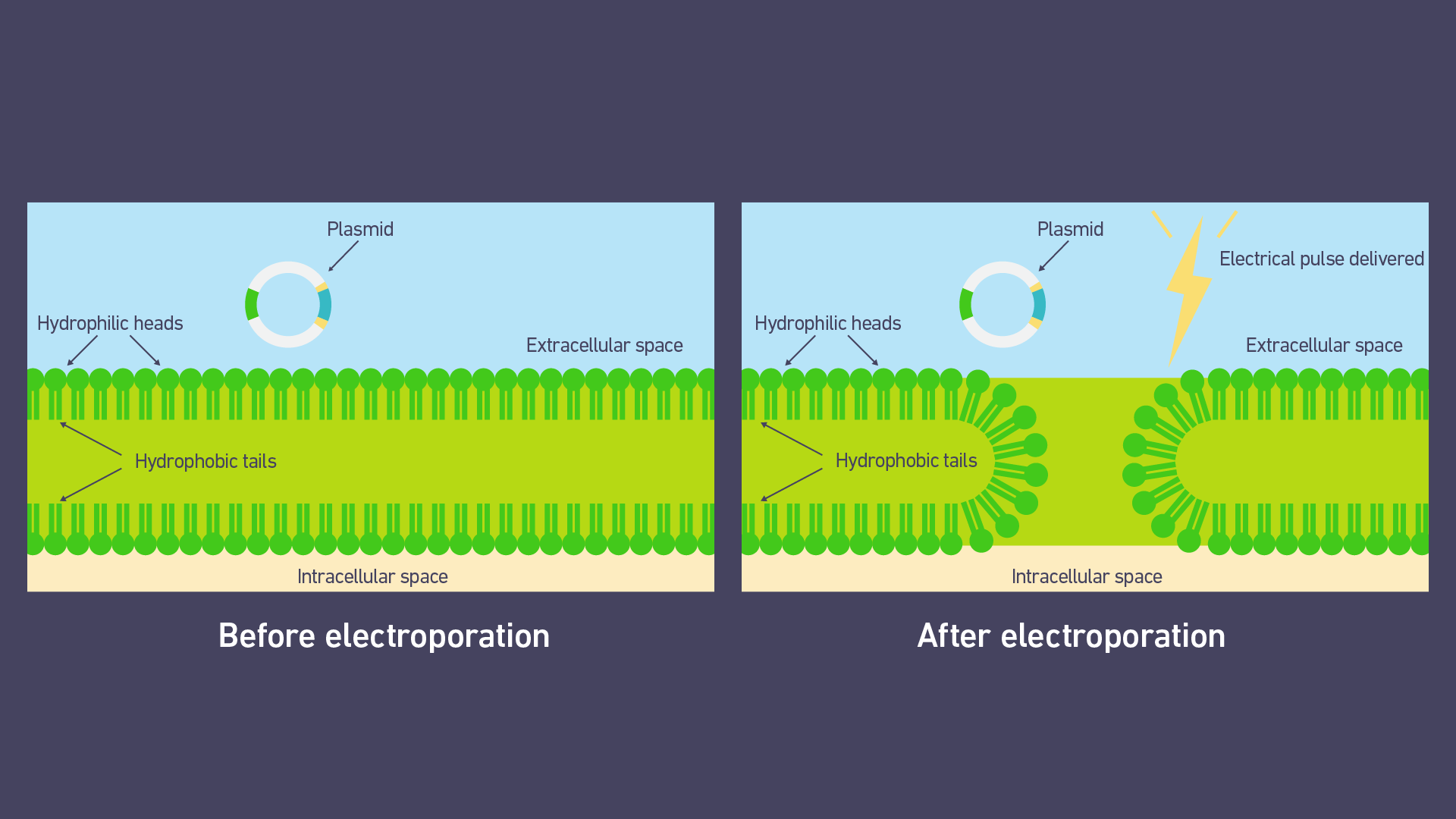 圖2:電穿孔過(guò)程中細胞膜破壞和孔隙形成的示意圖。圖片來(lái)源:Technology Networks。