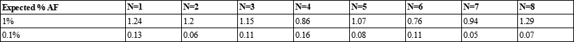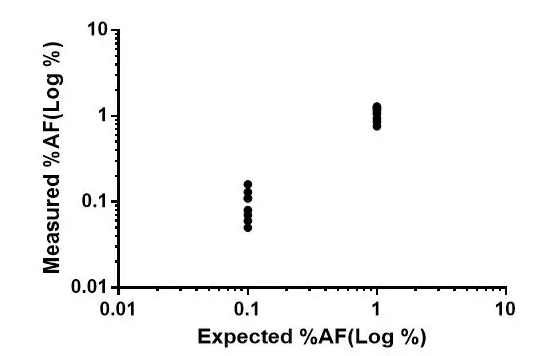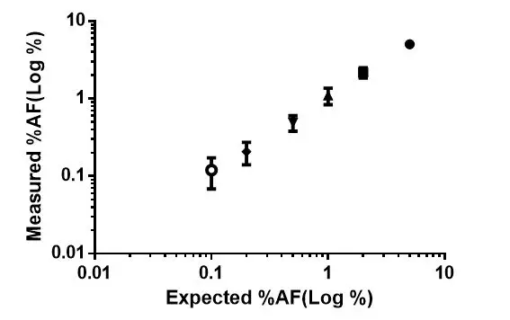 待測樣本:不同%AF的EGFR T790M的標準品,依次為5%,2%,1%,0.5%,0.2%,0.1%。