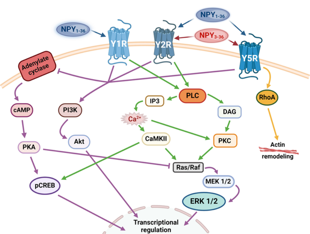 在人類(lèi)中,NPY主要通過(guò)三種GPCR- Y1R、Y2R和Y5R起作用。Y1R需要全長(cháng)NPY1-36才能激活,而Y2R和Y5R也可以結合NPY3-36。所有NPY受體通過(guò)Gi/o蛋白發(fā)出信號,并通過(guò)腺苷酸環(huán)化酶抑制cAMP合成,從而阻斷PKA對下游通路的抑制作用。NPY信號傳導的第二種機制是針對Y1R和Y2R的,涉及Ca 2 +的動(dòng)員以及隨后PKC和CaMKII的鈣依賴(lài)性激活。同時(shí),這些信號通路導致ERK1/2的激活。此外,所有NPY受體都能夠激活PI3K/Akt通路。Y5R的具體特征是能夠激活RhoA,從而調節細胞骨架重塑。
