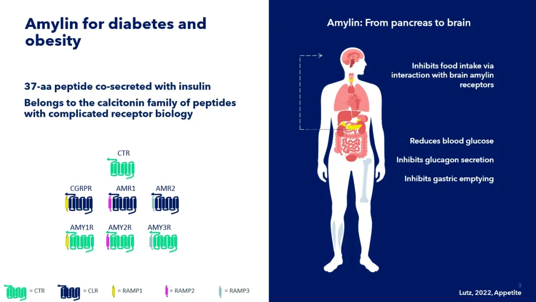 胰淀素(Amylin)是胰島β細胞分泌的"智能激素",和胰島素是好搭檔。胰淀素要發(fā)揮作用,必須找到它的專(zhuān)屬"接收器"——胰淀素受體(AMYR)。該受體由降鈣素受體(CTR)與受體活性修飾蛋白(RAMP1、RAMP1和 RAMP3)異源二聚化形成。