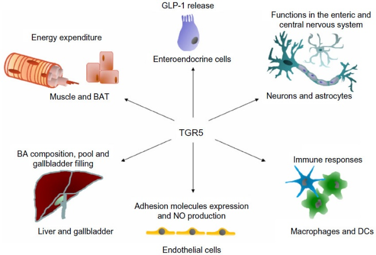 TGR5在多種細胞類(lèi)型中被研究,如肌肉細胞、脂肪細胞、內皮細胞(ECs)和巨噬細胞。TGR5的功能依賴(lài)于細胞類(lèi)型,從胰高血糖素樣肽-1 (GLP-1)的釋放和線(xiàn)粒體能量穩態(tài)到炎癥反應的控制。