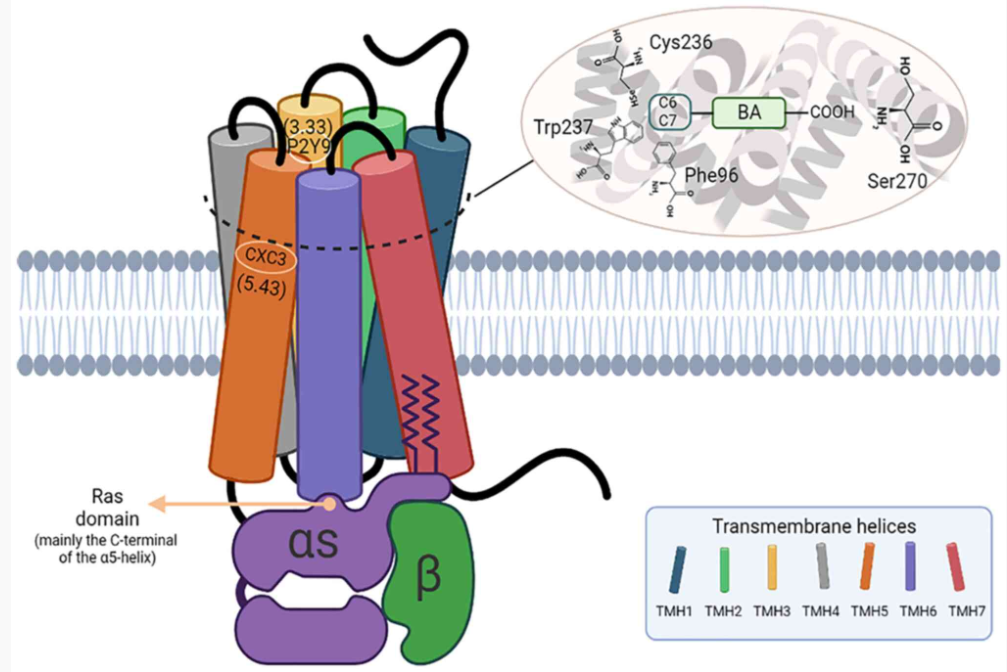 TGR5 受體是第一個(gè)已知的膽汁酸特異性G蛋白偶聯(lián)受體,也被稱(chēng)為膽汁酸受體 1(GPBAR1),屬于 A 類(lèi) G 蛋白偶聯(lián)受體(GPCR)亞家族。該受體由七個(gè)跨膜螺旋(TMH1-7)、三個(gè)胞外環(huán)(ECL1-3)組成,有助于配體結合,以及三個(gè)胞內環(huán)(ICL1-3),參與將信號傳遞給下游信號分子。