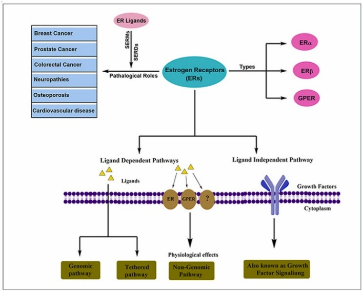在過(guò)去的幾十年中,ER在前列腺癌、結腸直腸癌和乳腺癌等各種癌癥中的作用已被深入研究。研究表明,雌激素受體不僅會(huì )介導乳腺癌的發(fā)生,而且在許多其他的人類(lèi)病理(如心血管疾病、骨質(zhì)疏松癥和肥胖、阿爾茲海默癥、自身免疫性甲狀腺疾?。┲邪l(fā)揮作用。
