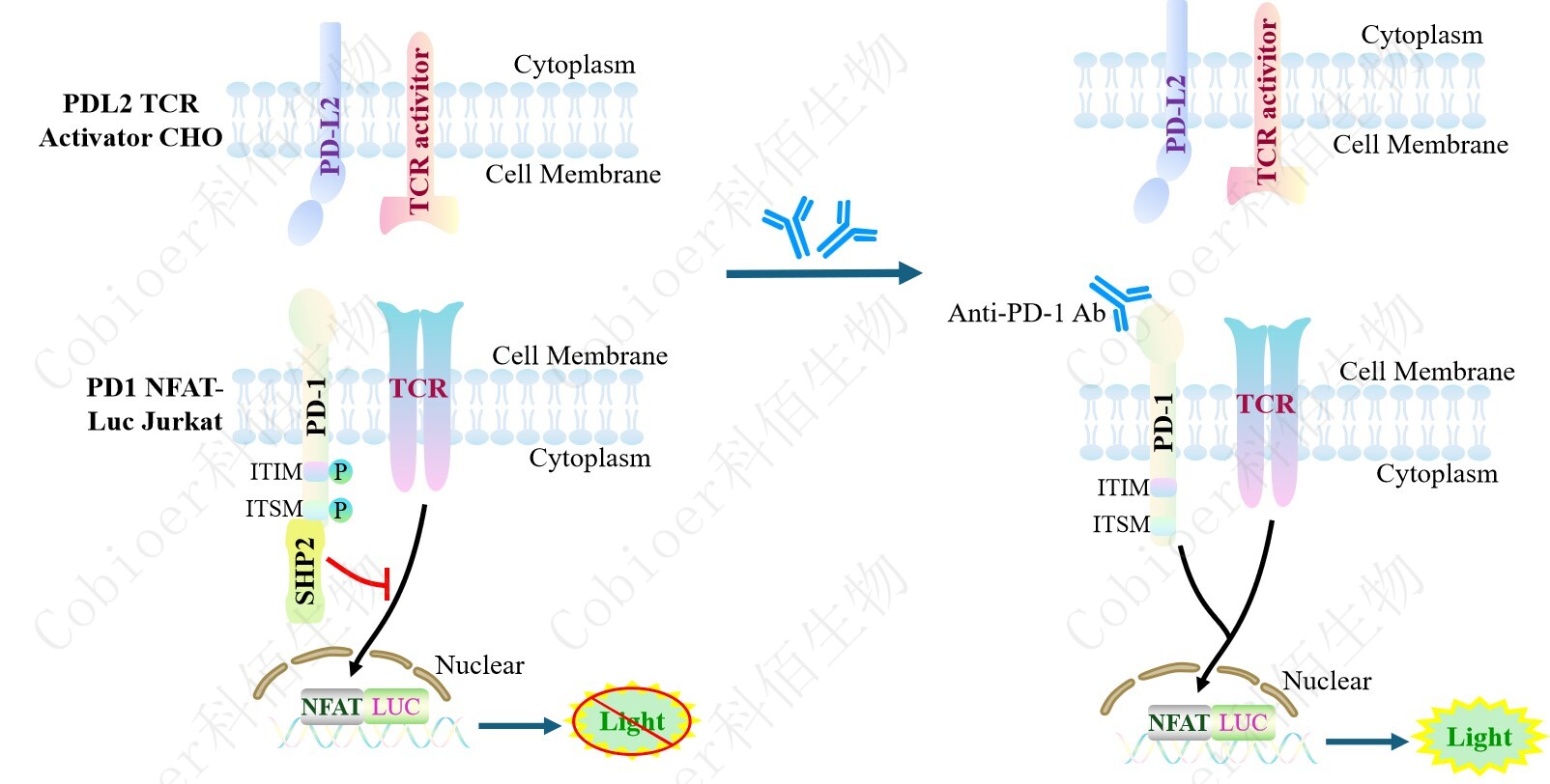 PDL2 TCR Activator CHO 細胞作為 PD1 NFAT-Luc Jurkat 細胞的靶細胞,很好的模擬了 體內 PD1&PDL2 的信號轉導過(guò)程,原理見(jiàn)下圖所示。![]() Figure 1. PDL2 TCR Activator CHO 細胞模型原理圖
