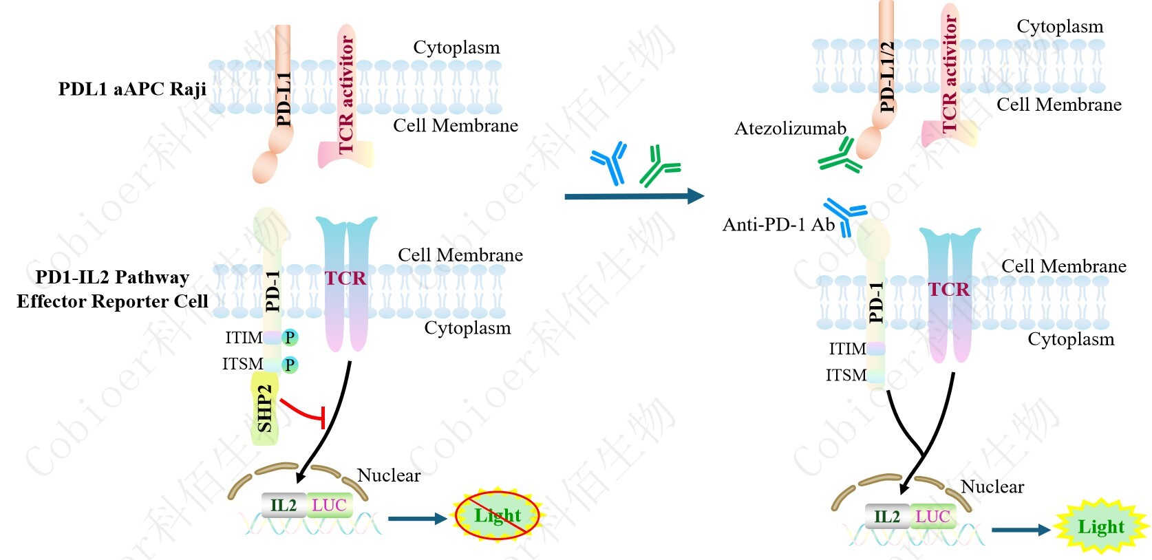 PDL1 aAPC Raji 作為 PD1-IL2 Pathway Effector Reporter Cell 的靶細胞,藥靶模型很好 的模擬了體內 PD1&PDL1 的信號轉導過(guò)程,原理見(jiàn)下圖所示。![]() Figure 1. PDL1 aAPC Raji 模型原理圖
