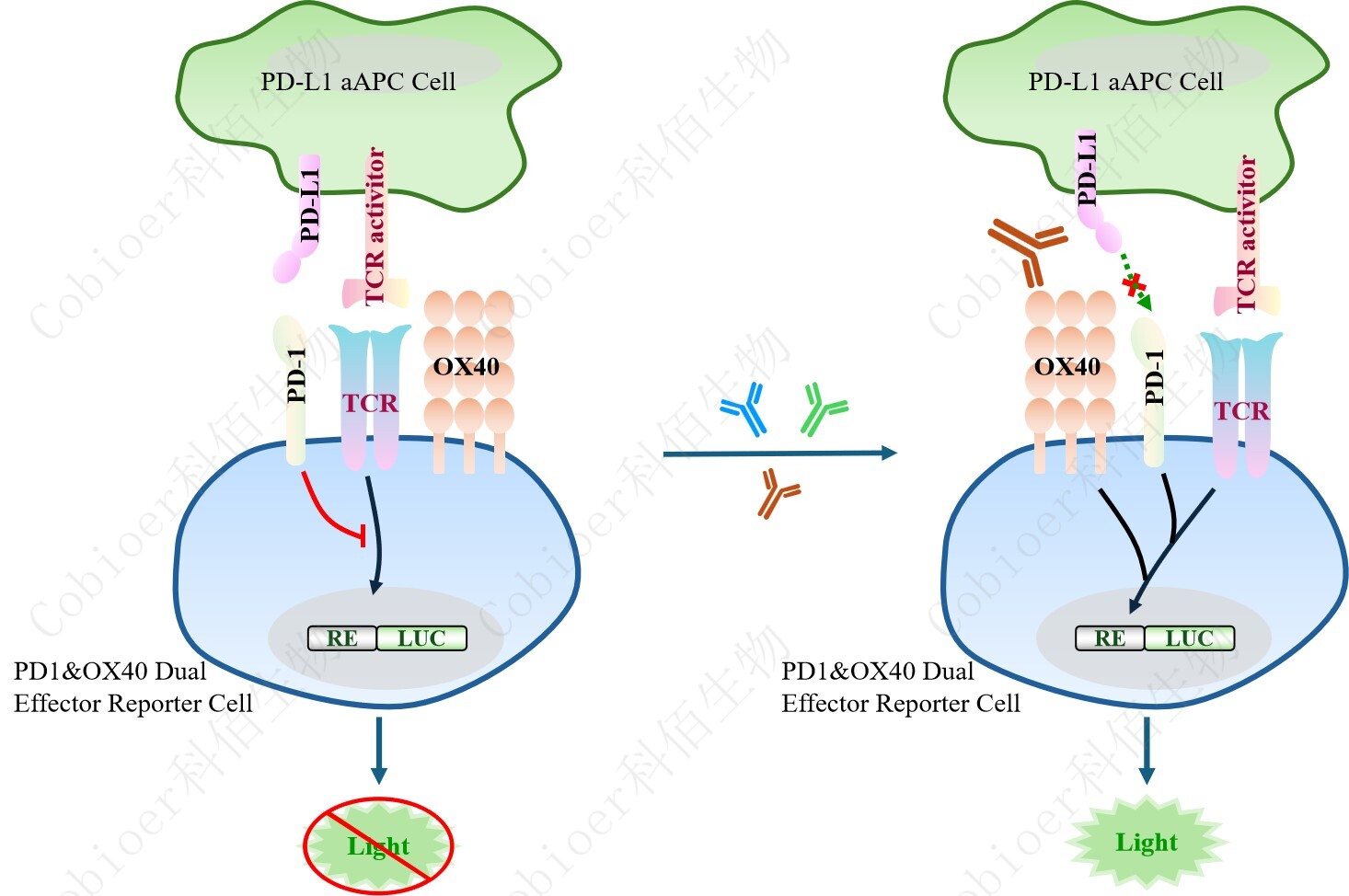 PD1&OX40 Dual Effector Reporter Cell 報告基因藥靶模型很好的模擬了體內 PD1&OX40 的信號轉導過(guò)程,原理見(jiàn)下圖所示。