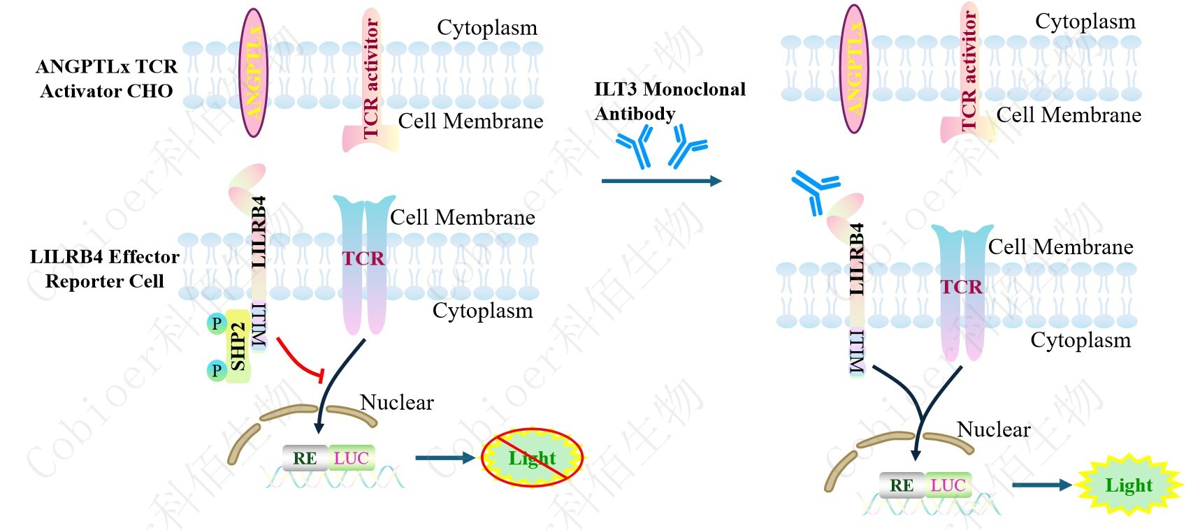 ANGPTLx TCR Activator CHO 作為 LILRB4 Effector Reporter Cell 的靶細胞,很好的模 擬了體內 LILRB4 的信號轉導過(guò)程,原理見(jiàn)下圖所示。![]() Figure 1. ANGPTLx TCR Activator CHO 模型原理圖 |