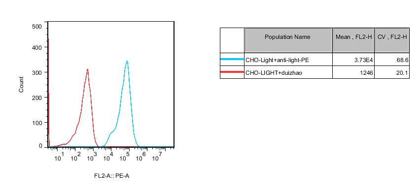 Figure. Recombinant stable clonal CHO cell line constitutively expressing full length human LIGHT protein, also known as TNFSF14, (Genbank #NM_003807). Surface expression is confirmed by flow cytometry. |