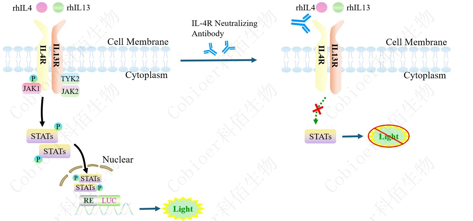 IL4/IL13 Effector Reporter Cell 報告基因藥靶模型很好的模擬了體內 IL4/IL13 的信號轉 導過(guò)程,原理見(jiàn)下圖所示。