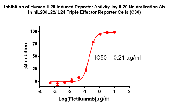 Figure 4. Inhibition of Human lL20-induced Reporter Activity by lL20 Neutralization Ab in hlL20/IL22/IL24 Triple Effector Reporter Cells(C30). |