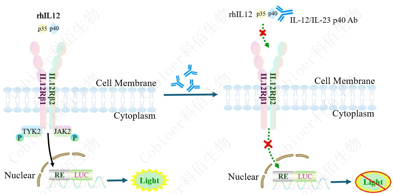 IL12 Effector Reporter Cell 報告基因藥靶模型很好的模擬了體內 IL12 的信號轉導過(guò)程, 原理見(jiàn)下圖所示。 ![]() Figure 1. IL12 Effector Reporter Cell 細胞模型原理圖 |