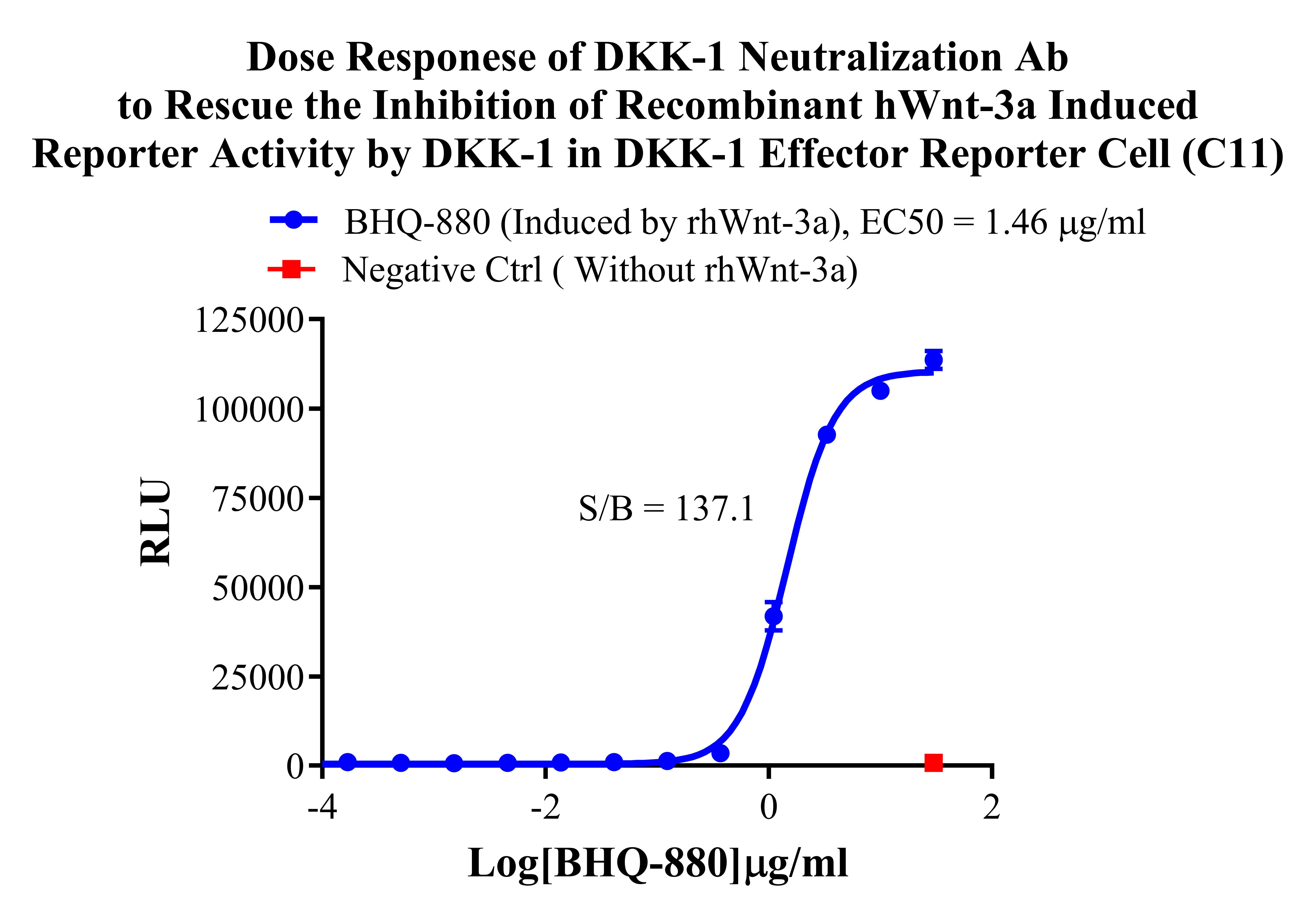 Figure 2.Dose Responese of DKK-1 Neutralization Ab to Rescue the Inhibition of Recombinant hWnt-3a Induced Reporter Activity by DKK-1 in DKK-1 Effector Reporter Cells (C11).