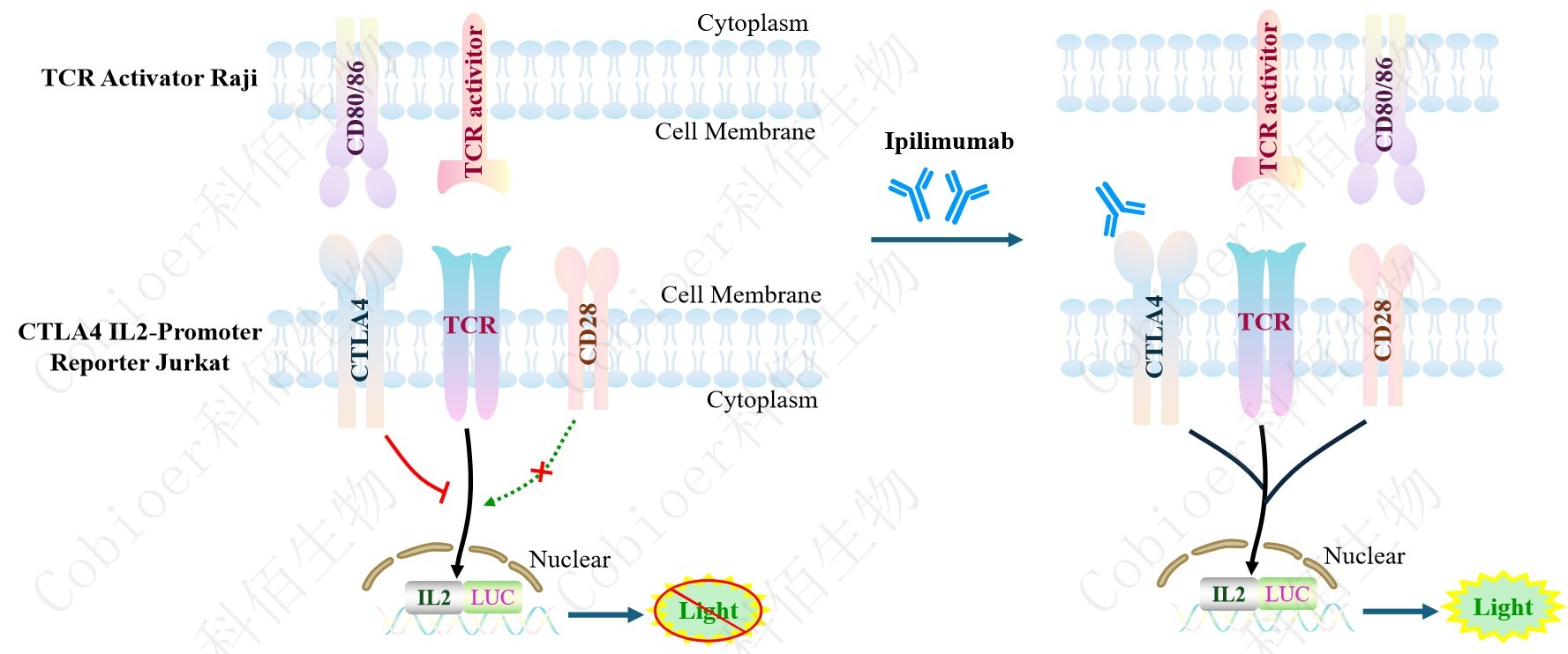 CTLA4 IL2-Promoter Reporter Jurkat 報告基因藥靶模型很好的模擬了體內 CTLA4&IL2 的信號轉導過(guò)程,原理見(jiàn)下圖所示。![]() Figure 1. CTLA4 IL2-Promoter Reporter Jurkat 細胞模型原理圖 |