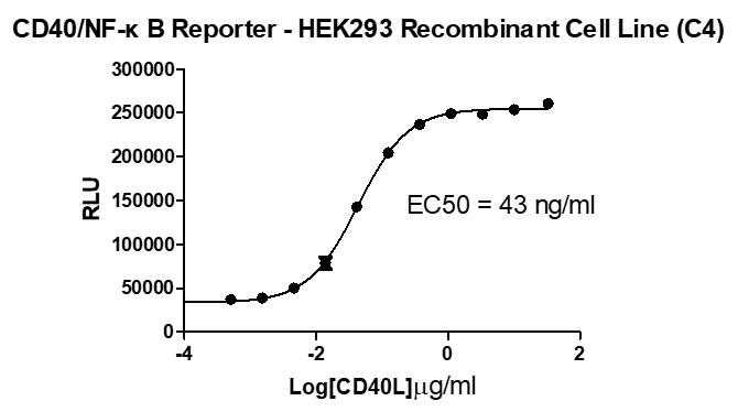 Recombinant HEK293 cell line expressing full length human CD40 (Tumor necrosis factor receptor superfamily member 5; TNFRSF5). This NF-kB luciferase reporter construct is stably integrated into the genome. |