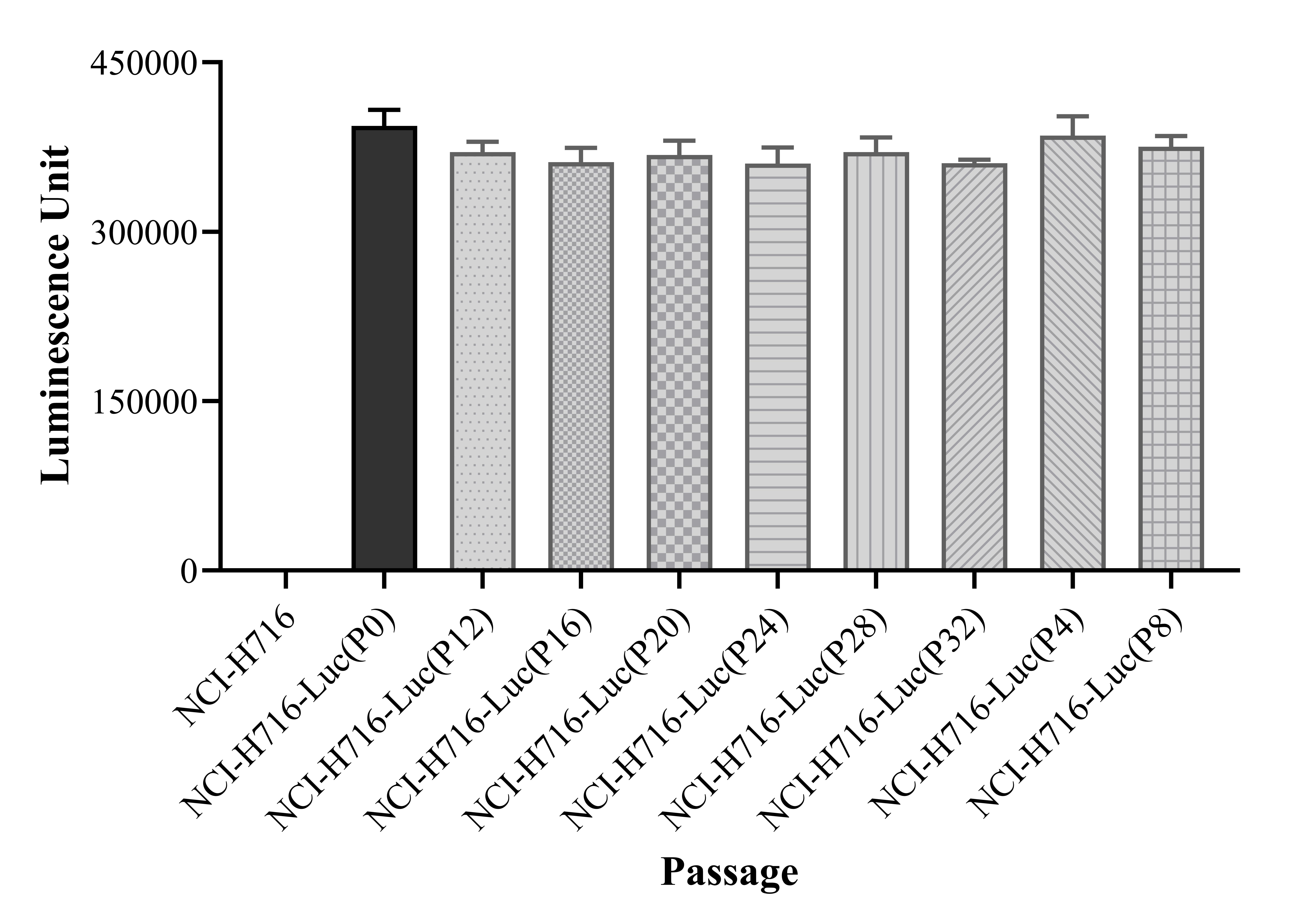 Figure 1. Stablity test results. NCI-H716-Luc showed at least 32 passage stability with similar luminescence unit. |