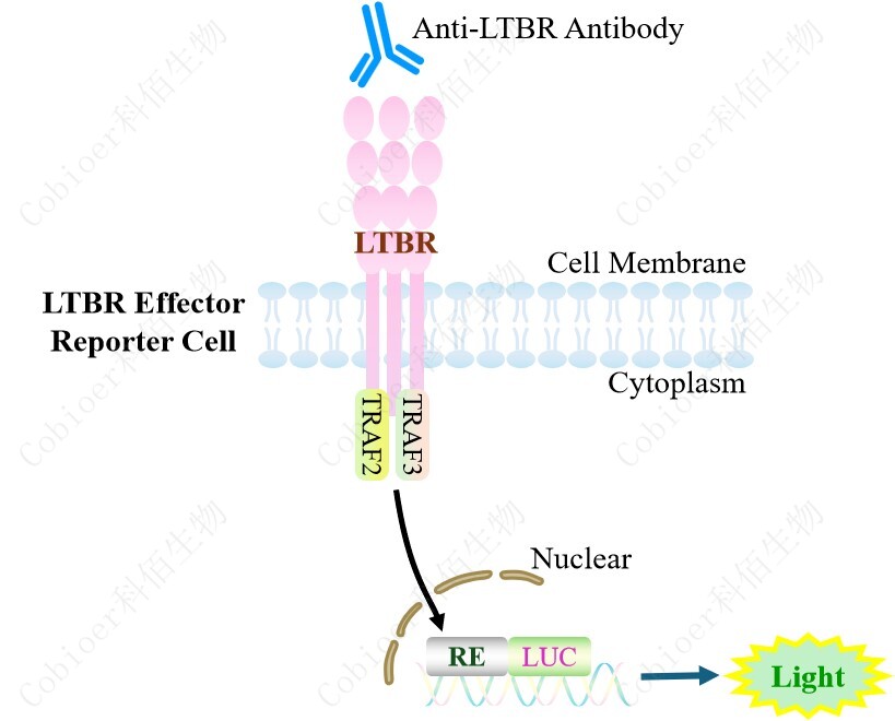 LTBR Effector Reporter Cell 報告基因藥靶模型很好的模擬了體內 LTBR 的信號轉導過(guò) 程, 原理見(jiàn)下圖所示。