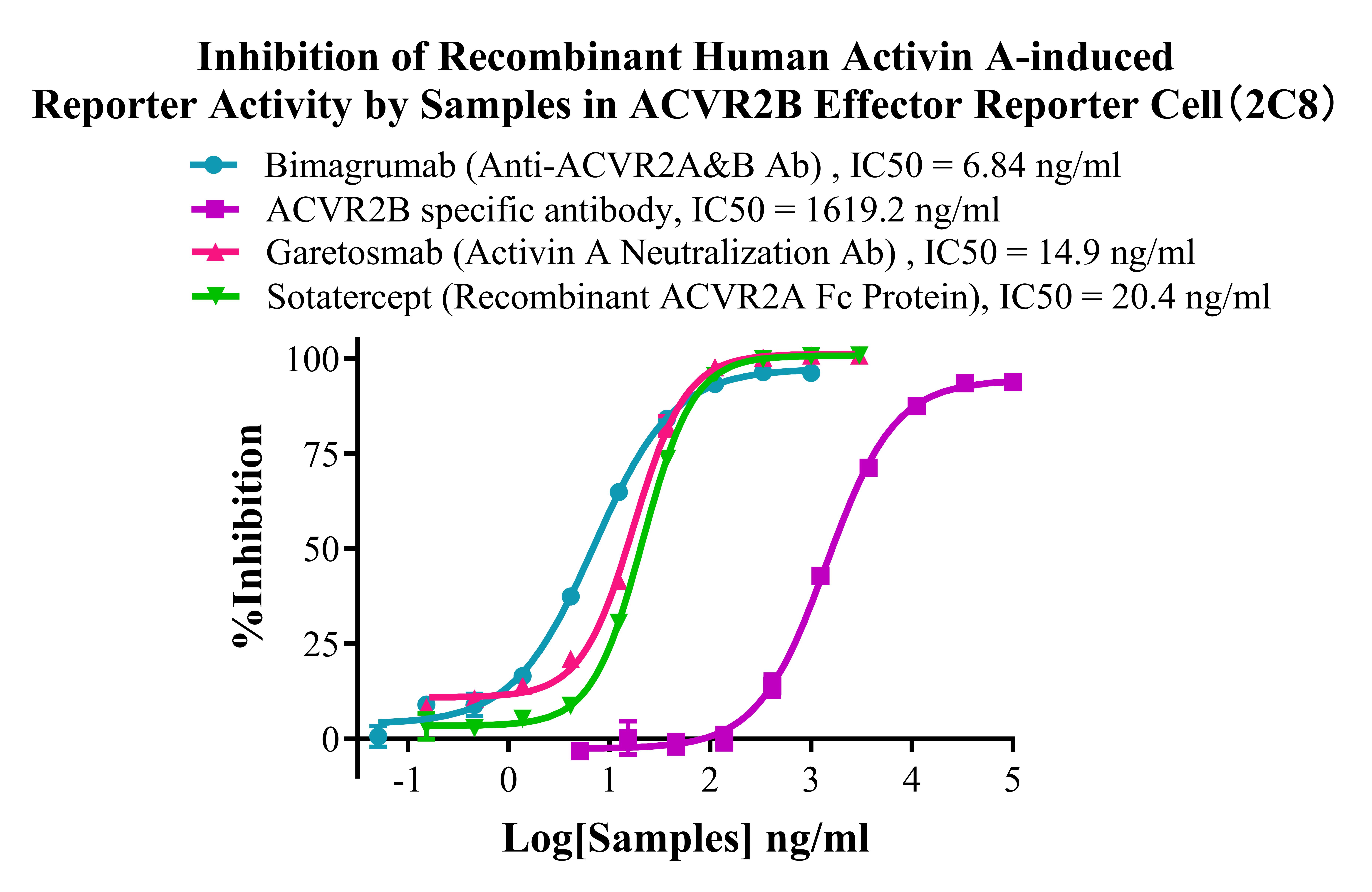 IV. Representative Data![]() Figure 2. Dose Response of Recombinant Human Activin A in ACVR2B Effector Cell(2C8). ![]() Figure 3. Inhibition of Recombinant Human Activin-induced Reporter Activity by Samples in ACVR2B Effector Reporter Cell (2C8). |